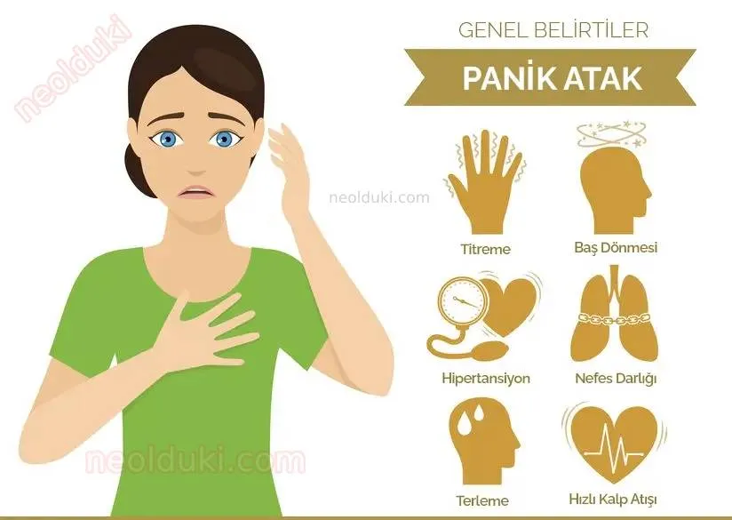Panik ataklar nefes darlığı, kalp çarpıntısı, baş dönmesi, bayılma, karında basınç veya mide bulantısı, el ve ayaklarda terleme, uyuşma, karıncalanma, titreme veya kızarma veya ölüm korkusu gibi beklenmedik yerlerde ortaya çıkabilir.